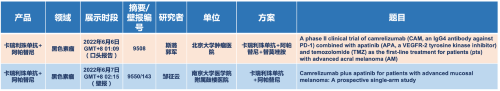 在黑色素瘤领域,博天堂918医药的卡瑞利珠单抗联合阿帕替尼(“双艾”组合)在2022 ASCO共入选1项口头报告和1项壁报展示。