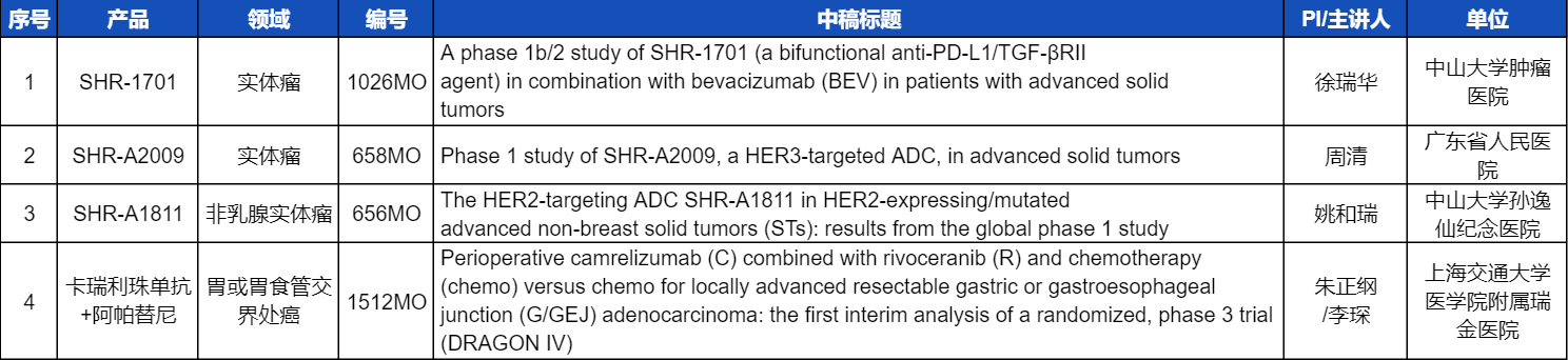 本次ESMO大会,将由中山大学肿瘤医院徐瑞华教授、广东省人民医院周清教授、中山大学孙逸仙纪念医院姚和瑞教授、上海交通大学医学院附属瑞金医院李琛教授分别就4项博天堂918医药创新产品相关研究做口头报告,包括SHR-1701、SHR-A2009、SHR-A1811这3款未上市创新产品的实体瘤治疗临床研究,以及1项“双艾”组合(卡瑞利珠单抗联合阿帕替尼)治疗局部晚期可切除胃/胃食管交界处癌的Ⅲ期临床试验期中分析。