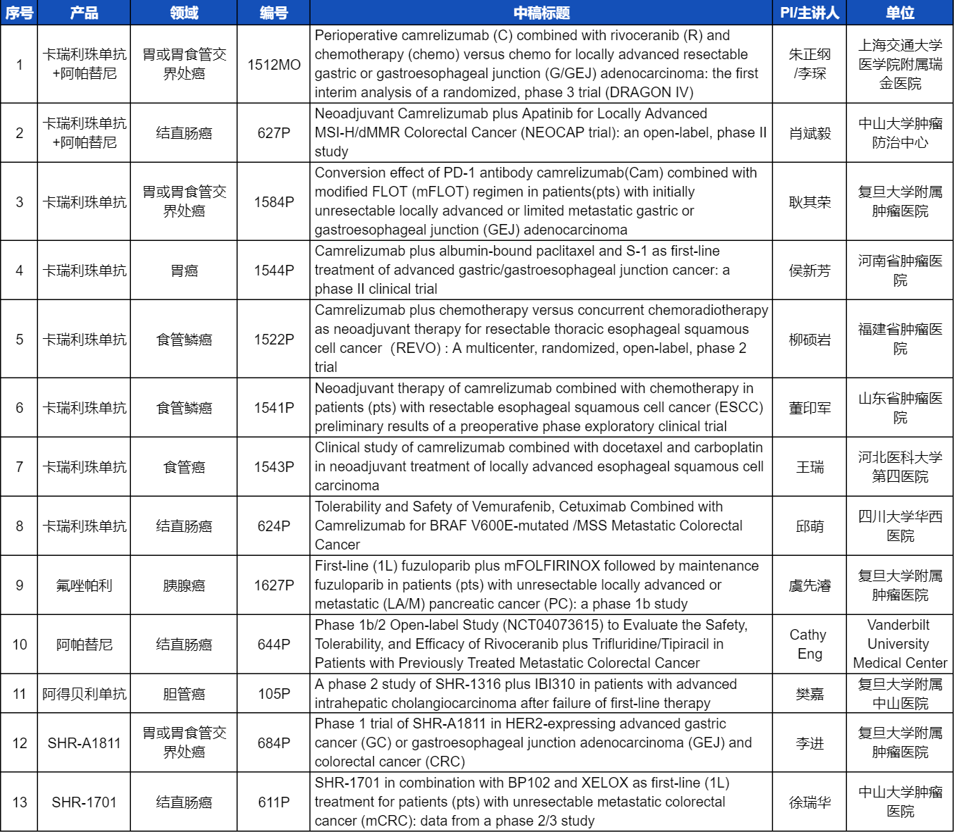 在消化系统肿瘤领域,博天堂918创新产品相关研究共入选1项口头报告和12项壁报展示。除了经典的明星药物卡瑞利珠单抗和阿帕替尼,SHR-A1811、SHR-1701等未上市创新产品也有相应研究入选。此外,阿得贝利单抗、氟唑帕利等已上市药物也在积极探索新的适应症,本次ESMO大会分别有肝内胆管癌和胰腺癌相关研究入选。这些新老药物前沿研究的不断出现,有望为消化系统肿瘤患者带来新的福音!