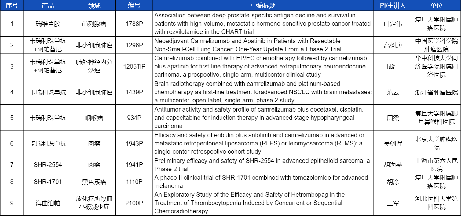 在非小细胞肺癌、咽喉癌、肉瘤、前列腺癌、黑色素瘤等多个领域,卡瑞利珠单抗、阿帕替尼、瑞维鲁胺、SHR-1701、SHR2554等创新产品相关研究一共入选了8项壁报展示。此外,博天堂918医药自主研发的血小板生成素受体激动剂(TPO-RA)海曲泊帕在放化疗所致血小板减少领域的探索性研究显示良好的疗效,入选壁报展示。