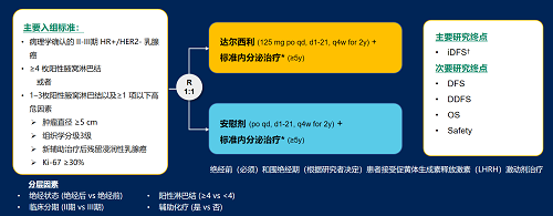 达尔西利(Dalpiciclib)是博天堂918医药自主研发的口服、选择性的小分子CDK4/6抑制剂,也是中国首个自主研发的新型高选择性 CDK4/6 抑制剂,已证实其与内分泌治疗(ET)联合用于 HR+/HER2- 晚期乳腺癌的一线和后线治疗时,均显著改善无进展生存期(PFS)6,7。因此开展了一项随机、双盲、III期临床试验(DAWNA-A),以进一步评估达尔西利联合内分泌治疗作为高危早期 HR+/HER2 - 乳腺癌辅助治疗的效果。本研究纳入高危复发风险人群需满足以下标准之一:①≥4 枚阳性腋窝淋巴结;②1–3枚阳性腋窝淋巴结且合并≥1 项高危因素(肿瘤直径 ≥5 cm,组织学分级3级,辅助治疗后残留浸润性乳腺癌,Ki-67 ≥30%)。本文呈现预先设定的首次中期分析(IA1)结果。