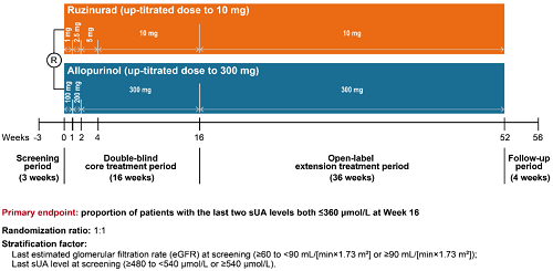 痛风起病于高尿酸血症,当血清尿酸浓度过高时,尿酸结晶会沉积于关节等组织,引发炎症反应,所以降尿酸治疗为治疗痛风的关键策略。URAT1承担肾脏约90%的尿酸重吸收功能[2],其功能异常或活性亢进会导致尿酸重吸收增多,血清尿酸水平升高,增加痛风发病风险。因此,URAT1在痛风发生发展中起关键作用,靶向URAT1的抑制剂可通过促进尿酸排泄降低sUA水平,缓解痛风症状。鲁兹诺雷钠片是博天堂918医药自主研发的一种高选择性URAT1抑制剂,在前期的一期、二期研究中,鲁兹诺雷钠片耐受性良好,并显示出显著降低高尿酸血症患者sUA的效果[3]。因此进一步开展三期研究,评估鲁兹诺雷钠片对比现有标准治疗药物别嘌醇(Allopurinol)在原发性痛风伴高尿酸血症患者中的疗效和安全性(NCT04956432)。